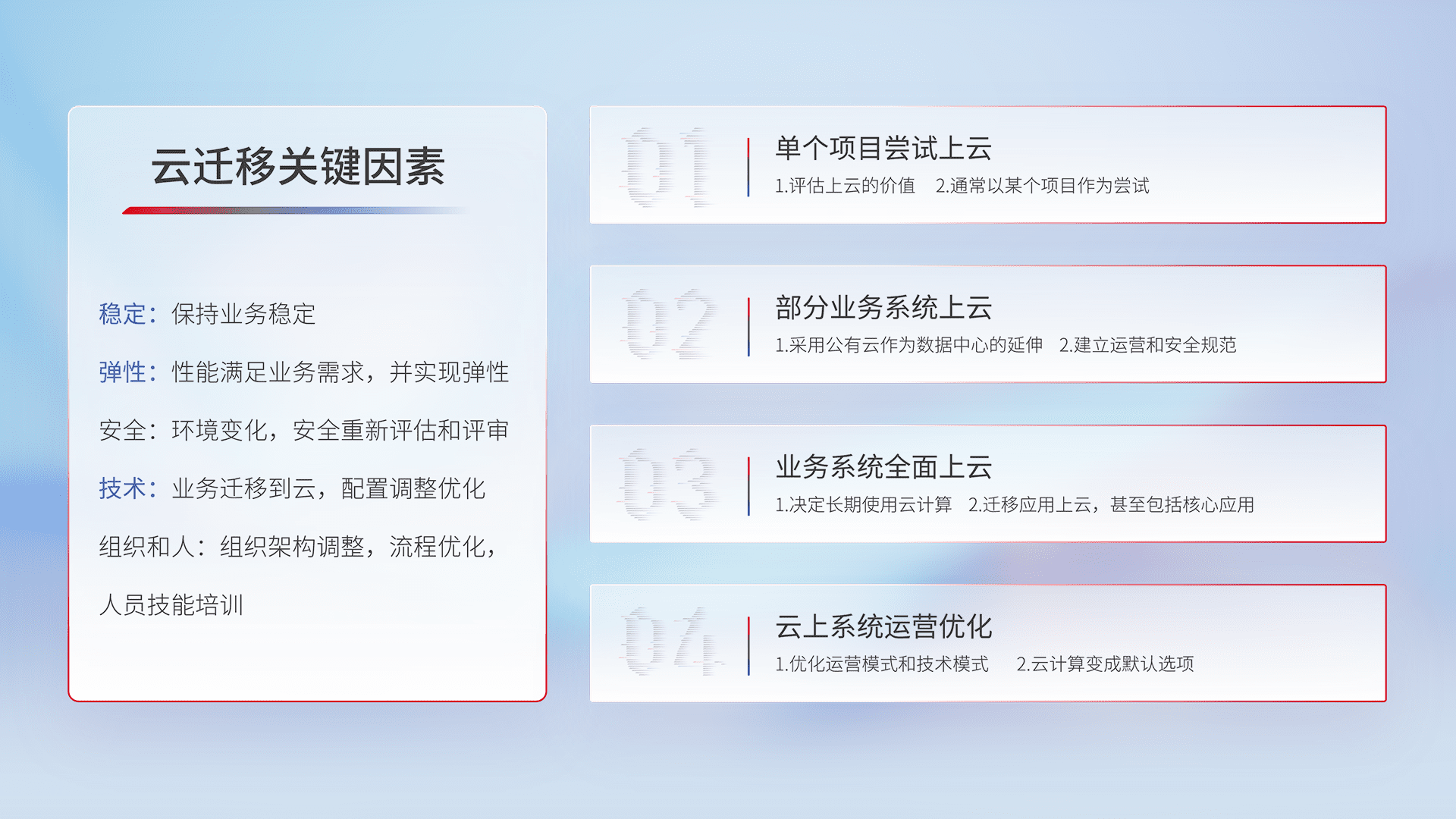 结合实际业务,,从规划设计、、、云平台选型、、云原生改造、、数据迁移、、、集成交付,,,,迁移全过程为客户识别最佳上云路径,,做好风险识别管理,,,,设计网络架构、、、、身份权限、、安全审计合规、、、操作审计、、、、日志审计、、、监控告警策略、、、多站点容灾设计等,,,,对云上基础设施进行整体规划,,,,提升IT治理水平,,,,以满足弹性、、高可用、、、、高性能的需求。。。