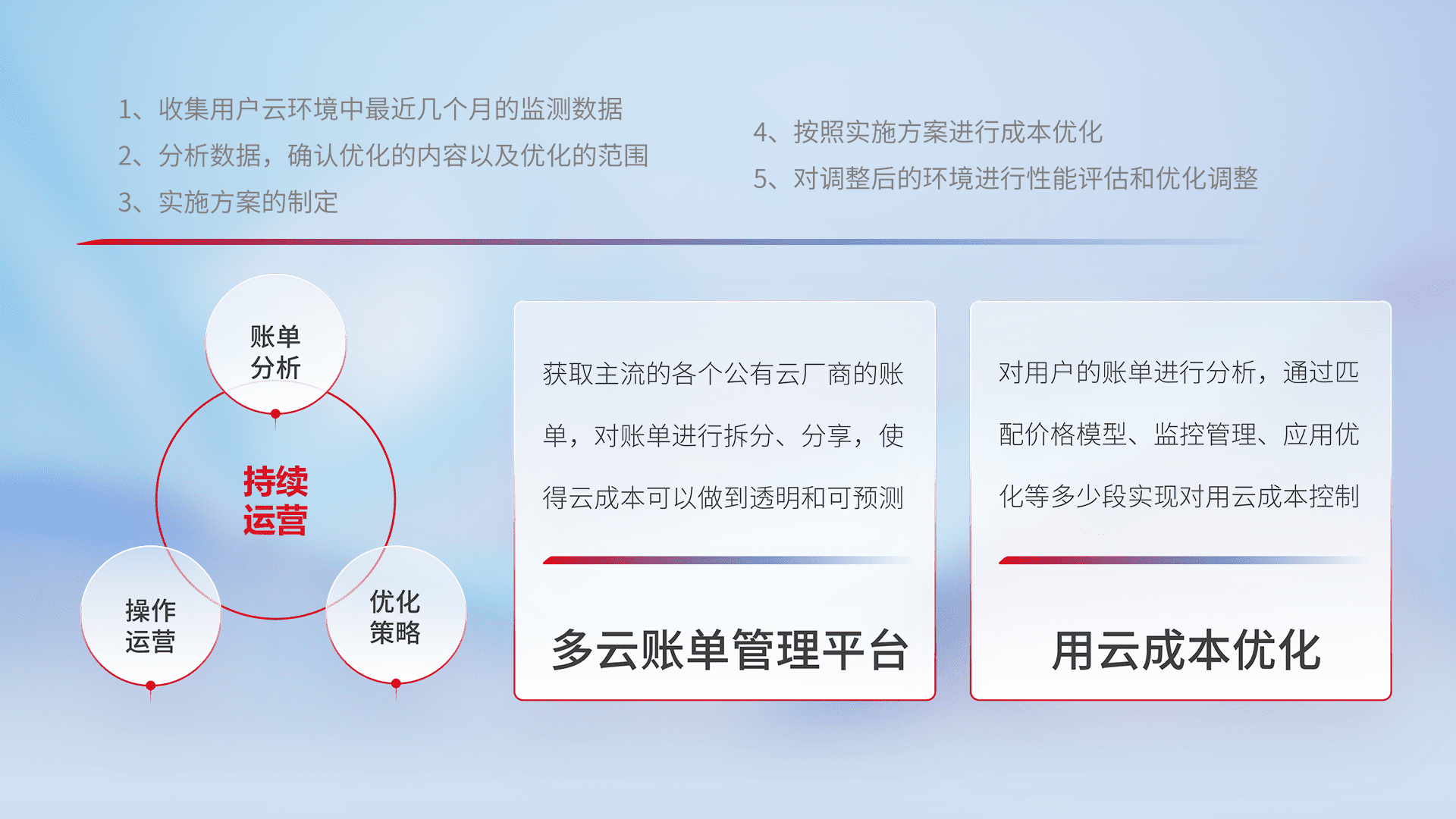 通过多云纳管,,,以统一的资源数据模型把客户的云资源进行抽象和封装,,,进而实现对多云资源的统一操作,,,保障云资源管理的可靠性、、、稳定性与可用性。。。量身定制化运维内容,,,,配置、、、、开发运维、、、补丁管理、、、备份、、、、监控、、认证和访问管理、、、审计和日常巡检等,,保障在用云过程中的可靠度,,,稳定度以及高可用率。。。。
