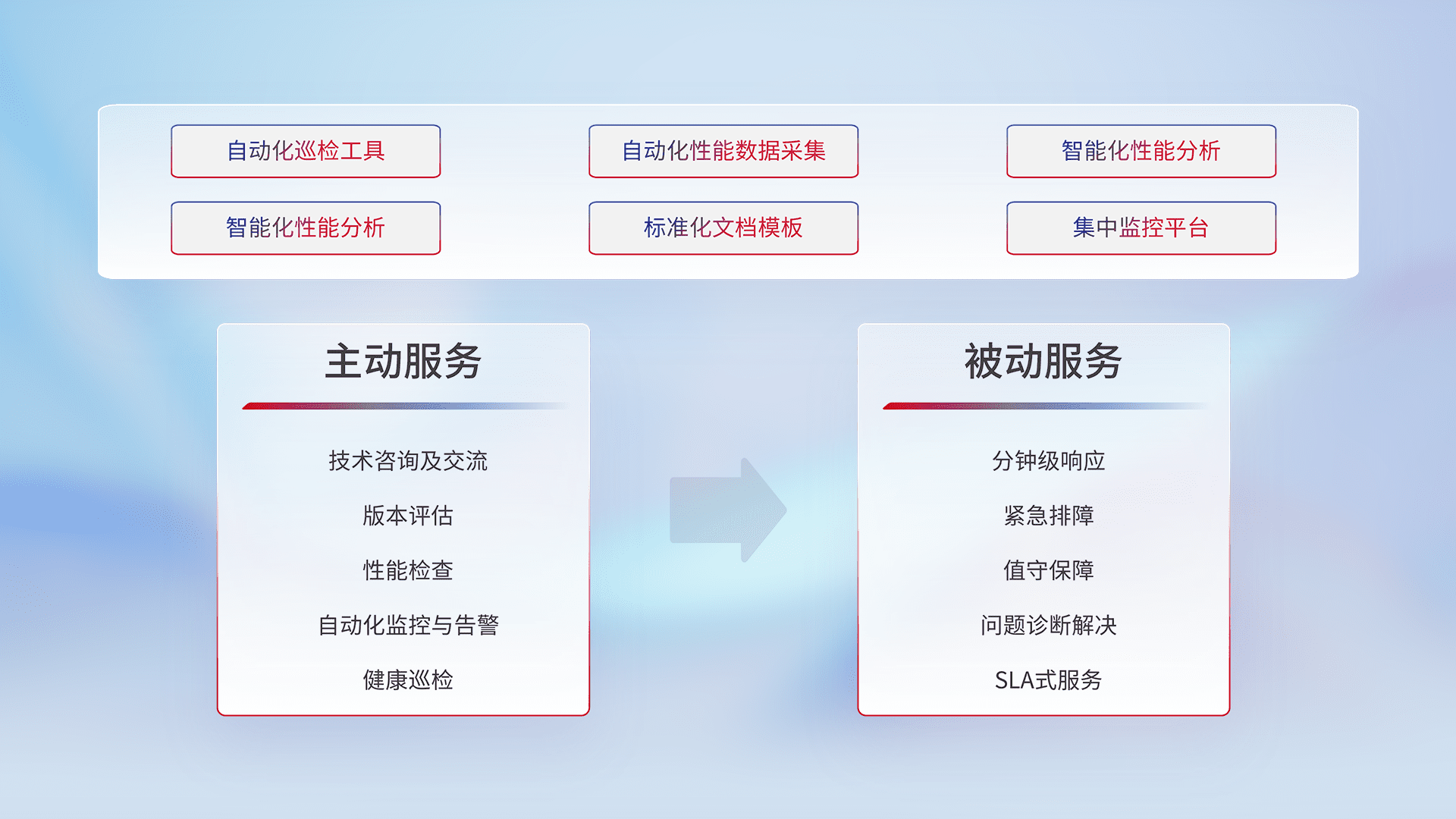 智能化工具和标准化文档,,保障服务质量,,,,提供主动服务(包含技术咨询、、、版本评估、、性能检查、、、自动化监控与告警、、、健康巡检)和被动服务包含(分钟级响应、、、、紧急排障、、值守保障、、、、问题诊断解决、、SLA服务)。。。