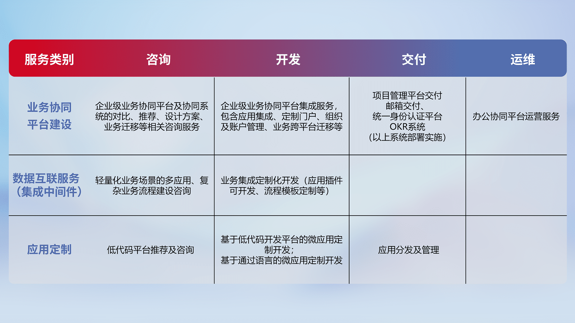 针对钉钉、、企微、、IDaas等平台级产品提供产品的规划、、方案、、、、交付、、、定制化开发等服务,,实现如统一协同办公、、、、智能客户服务、、、、混合会议管理、、智能数据查询、、等业务场景,,,实现数字化转型。。。